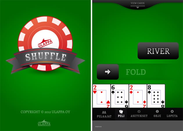 20.11.2012 • Käyttöliittymät, Mobiilisovellukset Ulappa Shuffle Texas Hold ‘Em -sovelluksen (iOS, Android) logo ja käyttöliittymäsuunnittelu. Download-linkit tulossa.